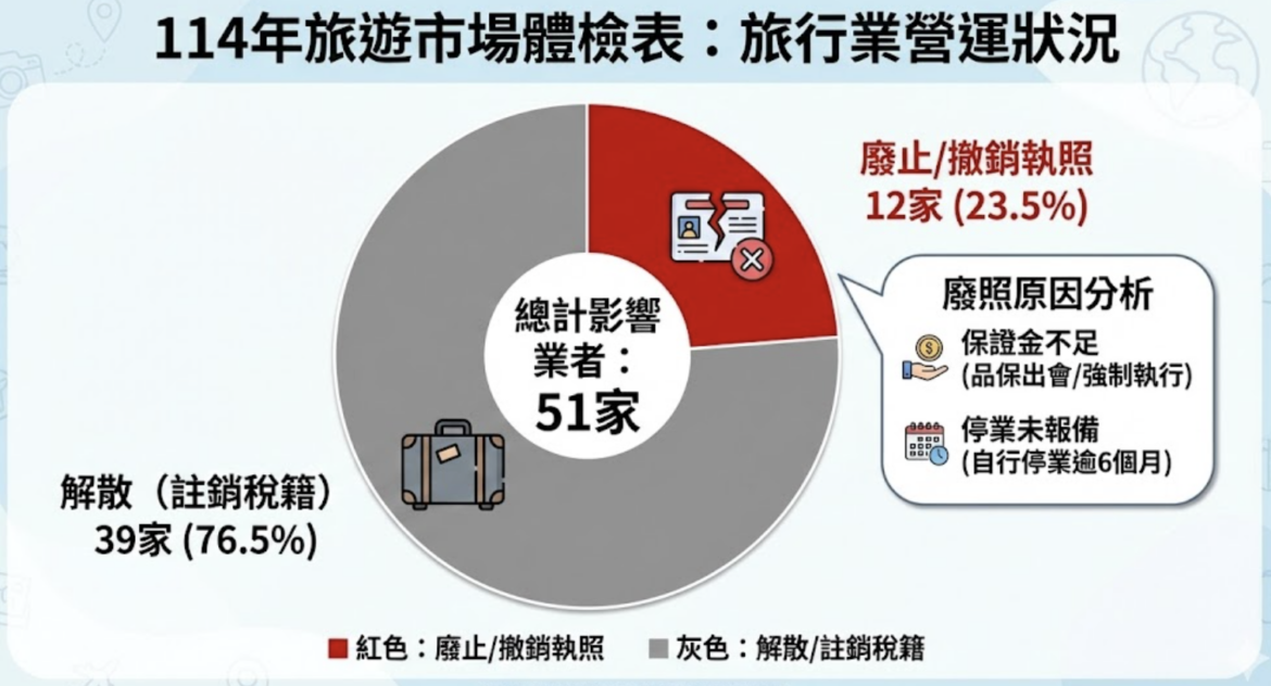 隨著年度旅遊旺季寒假與春節腳步臨近,國內外旅遊市場買氣回溫,然而在市場一片繁榮背後,卻隱藏著旅行業者的營運危機。交通部觀光署近期依據「發展觀光條例」第43條規定,公告今年度旅行業最新營運現況,數據顯示,今年共有39家旅行社申請解散,另有12家旅行社因保證金不足、逾期未報備等事由,遭主管機關廢止或撤銷執照。此項公告旨在保障消費者權益,確保國人在規劃行程時,能避開營運不善的黑名單,避免發生求償無門的窘境。