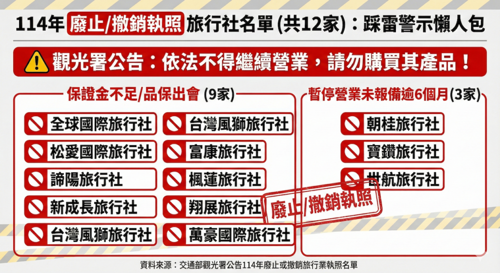 根據觀光署提供的詳細名單,12家遭到廢止或撤銷執照的旅行社中,最核心的問題在於「旅行業保證金」的維持。這顯示部分業者在財務週轉或法規遵循上的重大漏洞。