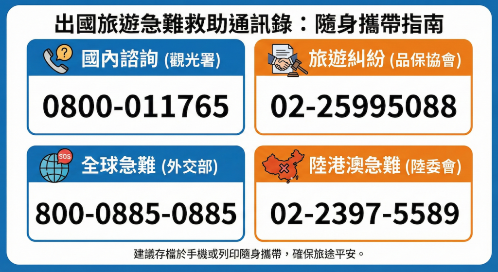 - 海外急難:外交部全球免付費專線800-0885-0885;陸港澳地區則撥打02-23975589。