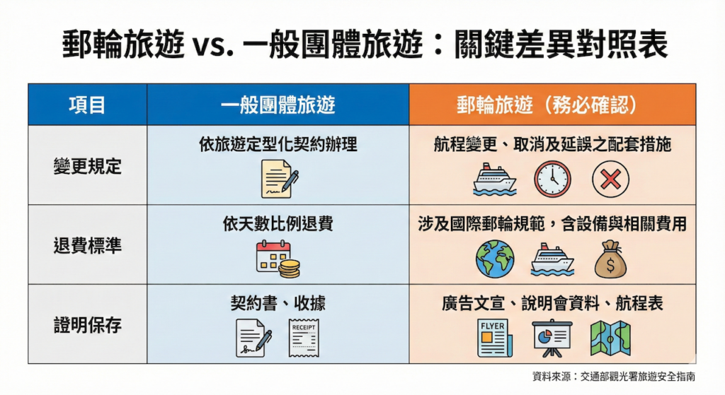 - 憑證留存:民眾應主動將郵輪航程的廣告、文宣、行程表或說明會內容保存,作為日後若發生糾紛時釐清責任與求償的依據。