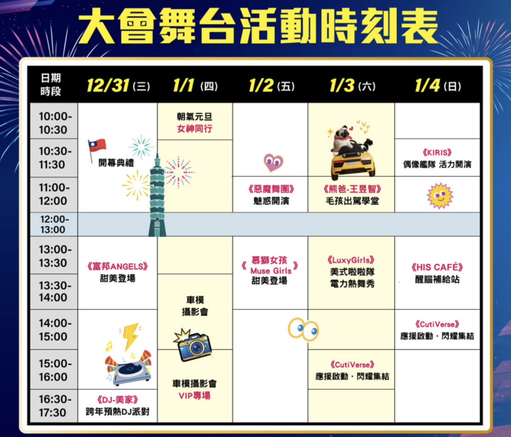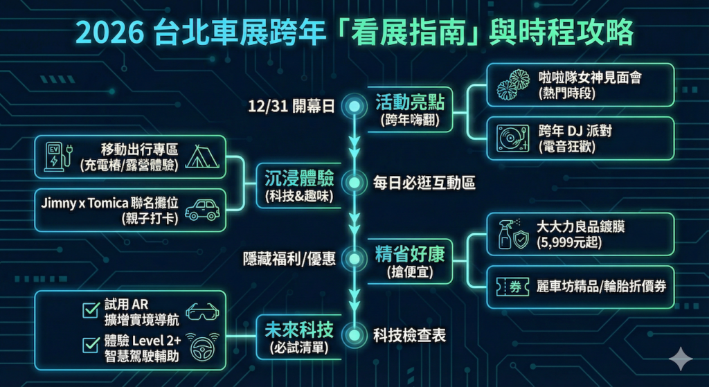 台北新車暨新能源車大展將在12月31日於世貿一館盛大開幕,這不只是一場汽車銷售展,更是一場結合了頂尖科技、跨界聯名與娛樂表演的跨年嘉年華,今年大展以「新能引航、永續出行」為主軸,除了23個汽車品牌全力出擊,現場更規劃了豐富的互動活動,從熱血的啦啦隊應援到深度的產業論壇。本報特別整理這份「看展指南」,教您如何在為期五天的展期中,精準捕捉每個亮點。