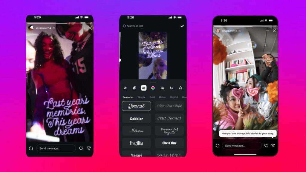 想回顧今年的專屬回憶嗎?打開限時動態,用「輪到你了」年末範本,搭配期間限定字體,把一年走過的風景、笑點與片段一次重溫;再用Edits跨年影片工具包,剪出專屬年度精華,為新年打造最有感的開場。還有最新登場的一鍵轉發限時動態功能,不僅可以快速轉發在限時動態上看到的熱門話題,更可輕鬆分享未被標記的感動瞬間!從回顧過往到迎接未來,Instagram讓跨年不單只是倒數,更是讓點滴回憶閃亮發光的重要時刻。