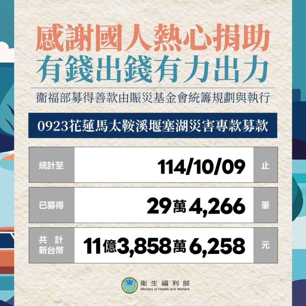 花蓮光復鄉釀災情後,賑災基金會9月25日開設「0923花蓮馬太鞍溪堰塞湖災害專案募款」,統計至10月9日止,捐款總額已達11億3858萬元。衛生福利部在臉書表達謝意,「感謝全國各地投入的救災超人們,以行動溫暖每一顆心、守護每一個家」,並承諾持續公開善款使用情形,讓愛的力量持續延伸。