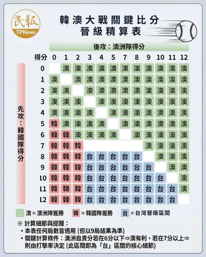 不過,中華隊能否如願晉級,命運全繫於今晚的韓澳大戰。根據大會賽制與數學精算,台灣晉級的首要大前提是「韓國必須擊敗澳洲」,且為了在三方平手的「失分率」比較中脫穎而出,韓國至少需以「8比3」擊退澳洲,才是中華隊最安全的晉級底線。