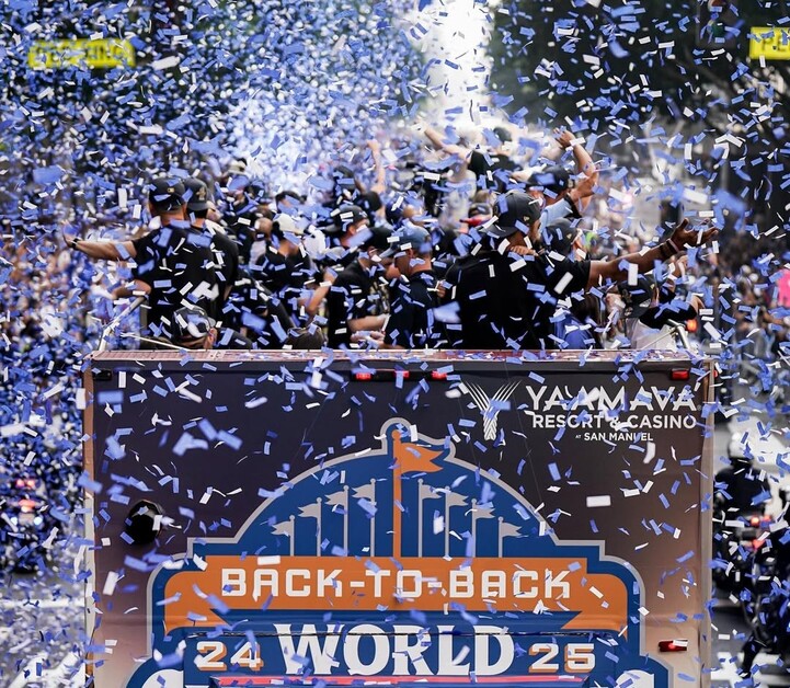 洛杉磯道奇隊遊行自市政廳出發,沿途球迷高舉標語、揮舞旗幟,與球員互動。許多人先前一直不看好道奇能夠衛冕成功,甚至藍鳥媒體人也曾經在發文談到,比較強的球隊沒有贏很可惜而引發爭議。