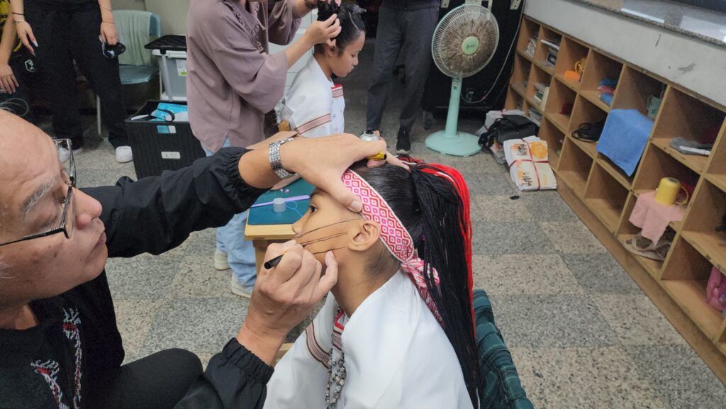 太魯閣族狩獵舞是呈現傳統太魯閣族狩獵的樣貌,從狩獵器具的前置準備、召喚狩獵團隊、莊嚴祭儀、正式狩獵,到凱旋歸來、婦女迎接、歌舞歡慶、歡喜賦歸。舞蹈完整展現太魯閣族敬天愛地、團結合作的精神,也象徵族人分享成果、感恩祖靈庇佑的文化信仰。校長余展輝也和The Royal Faimily解釋太魯閣族的紋面文化。