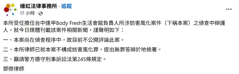 針對警方指控的妨害風化罪嫌,當事業者委任律師鄧傑於臉書發表聲明強調,目前已就本案不構成犯罪提出無罪答辯。民團分析認為,該會館屬於成人、自願、合意的消費空間,既無消費者控訴性暴力,亦無資方剝削或人口販運,是一場典型的「沒有受害者」的取締。警方投入大量公帑與精銳人力進行長達一個月的監視與誘捕,僅是為了處罰成人間的合意性行為,被質疑嚴重違反比例原則,並以空泛的道德風化名義踐踏個人的人權與性權。