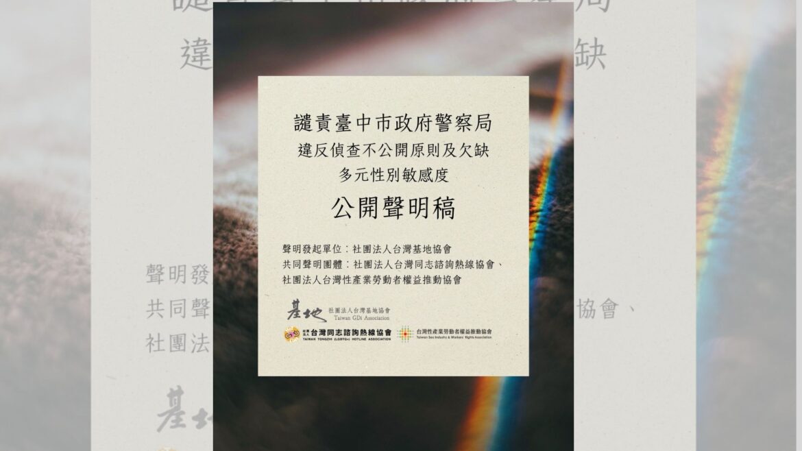 臺中市政府警察局第六分局近日高調宣佈破獲逢甲商圈一處同志生活會館,並以「難上加男」、「男警犧牲色相」等標題作為新聞稿標題吸引媒體報導。然而,此舉引發民間社團強烈反彈,包括台灣基地協會、台灣同志諮詢熱線及民間司改會等數個民權團體於昨(27)日晚間發表聯合聲明,嚴正譴責警方違反偵查不公開原則,且執法過程極度欠缺性別敏感度。