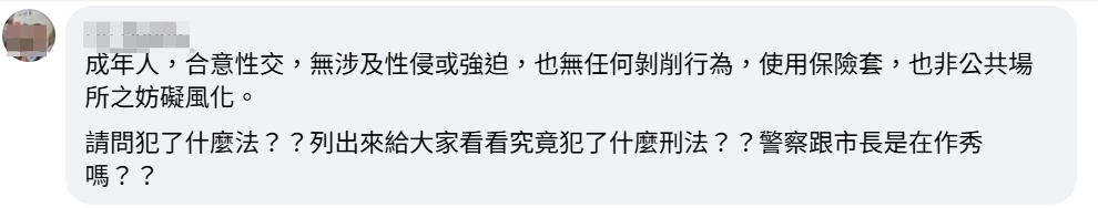 在社群媒體與新聞留言區,網友對於警方的「執法表演」呈現一面倒的批判,質疑這是一場「沒有受害者的取締」。有網友直言,成人、合意且使用保險套的性行為,在非公共場所並無涉及性侵、強迫或剝削,不解警方究竟是依據哪一條刑法進行攻堅?更有民眾反諷,現場並未查獲毒品,僅憑情趣用品就大張旗鼓宣傳,實質法學依據極度薄弱。